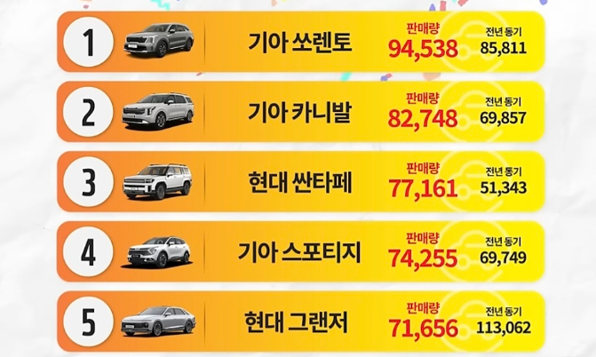 2024년에는 SUV천하라고 할 수 있는데요. 특히, 쏘렌토와 카니발, 산타페,스포티지 등 SUV의 판매량이 압도적이었습니다.