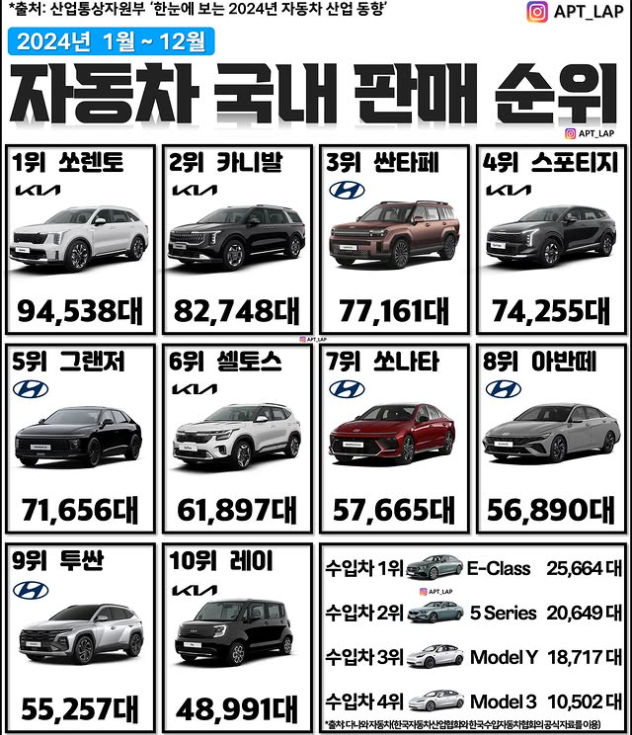 국산차 시장에서는 쏘렌토와 카니발이 각각 1위와 2위를 차지하며 큰 인기를 끌었습니다. 가족 중심의 차들부터, 실용성 높은 SUV와 세단까지 다양한 차종이 상위권에 올라 소비자들의 취향을 반영한 결과입니다.
