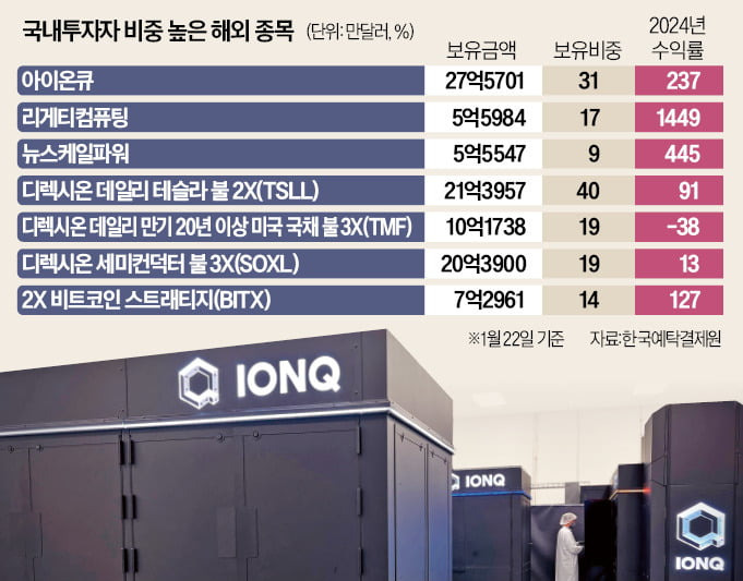 아이온큐는 양자컴퓨터 개발 기업으로, 한국계 김정상 듀크대 교수가 창업한 회사입니다. 2021년 뉴욕증시에 상장된 이 회사의 주가는 지난해 무려 237% 상승했으며, 현재 한국 투자자들이 보유한 아이온큐 주식의 가치는 27억5701만 달러(약 3조9494억원)로, 시가총액의 약 31%에 달합니다. 서학개미들은 양자컴퓨터와 같은 신기술 주식에 대한 관심이 높아지며, 해당 주식의 보유 비율을 빠르게 증가시키고 있습니다.