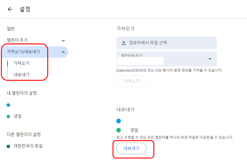먼저 구글 캘린더에 들어가서 우측 상단에 있는 톱니바퀴 설정 - 가져오기/내보내기를 통해서 ics파일로 내보내기를 합니다.