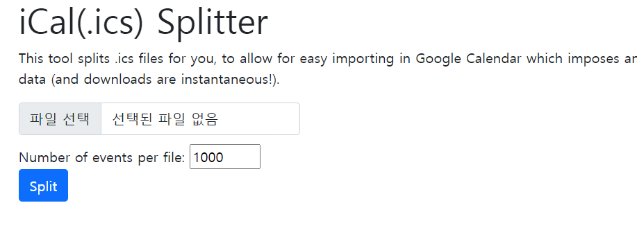 그리고 다운받은 ics파일을 아래의 사이트에서 쪼개기를 합니다. 이게 3메가를 넘으면 불러오기가 안된다고 해서 용량을 쪼개야 한다고 합니다.