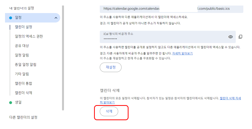 캘린더 삭제 메뉴에서 삭제를 누르면 캘린더가 전체 삭제 됩니다.