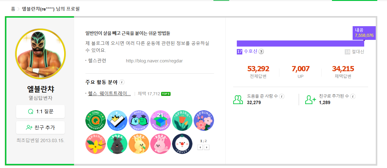 네이버 지식인에서 헬스 관련 답변을 달아주는 것으로 유명한 엘블란챠님에 대한 글입니다.