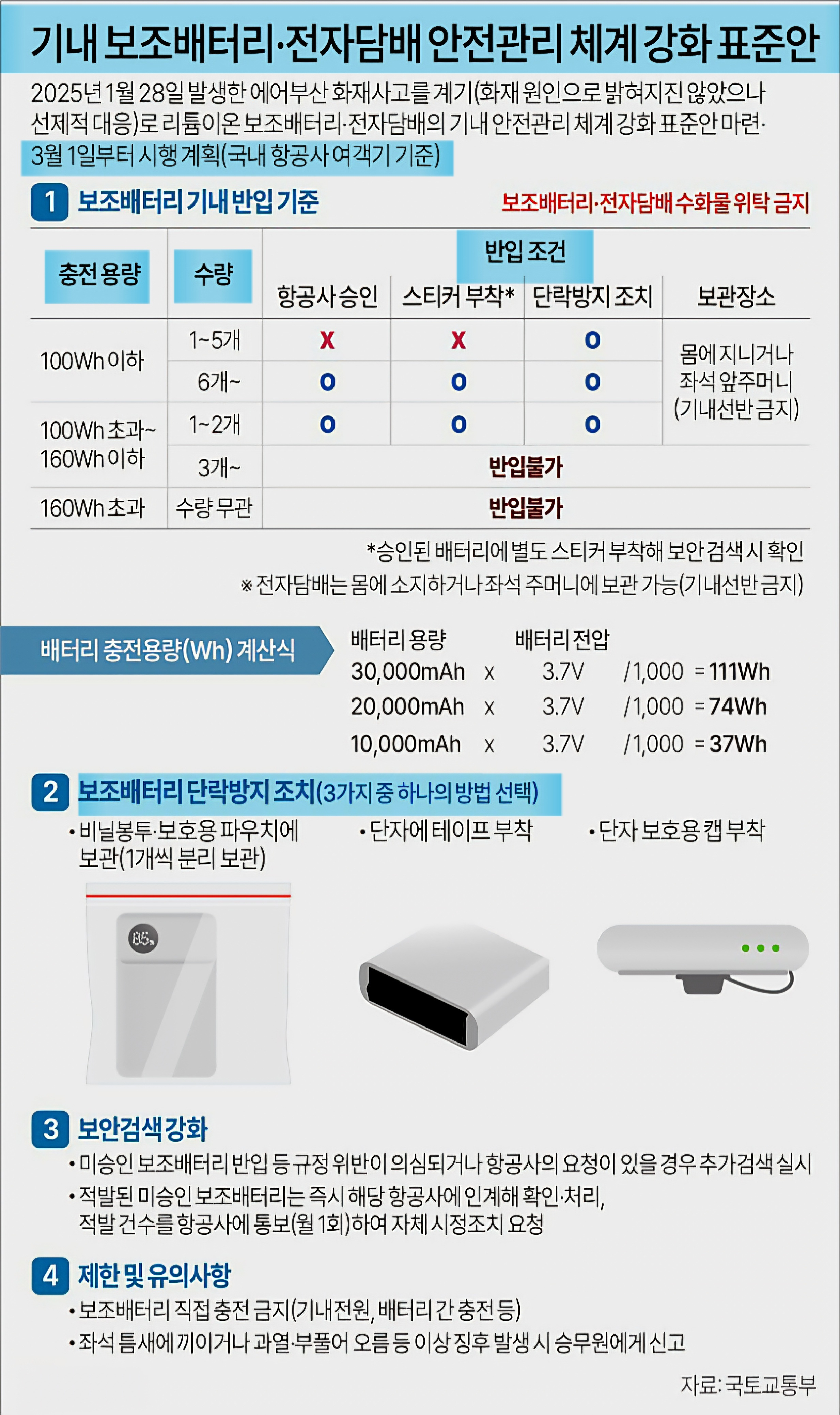 최근 발생한 에어부산 화재사고를 계기로 리튬이온 보조배터리의 안전관리 표준안이 3월 1일부터 시행된다고 합니다.