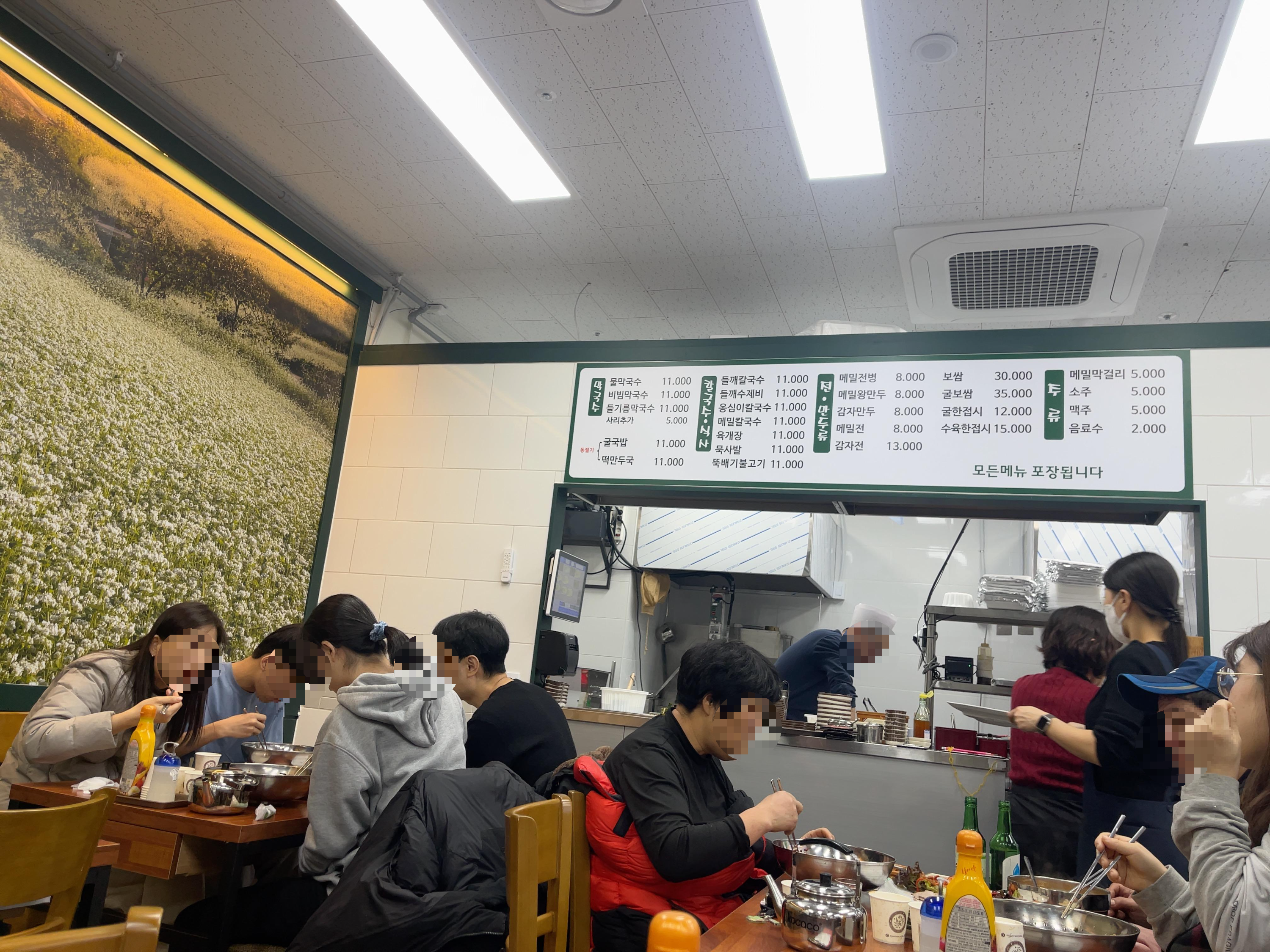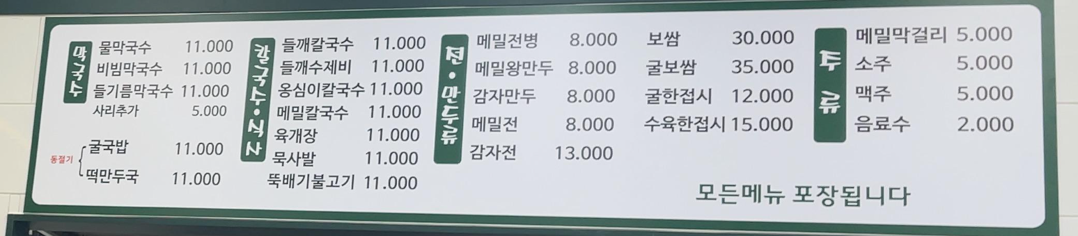 장점 : 물막국수, 비빔막국수에 요즘 들어 맛들인 들기름막국수도 판매중. 만두국이나 불고기, 육개장이 있어서 메밀이나 옹심이파가 아닌 사람을 데려가도 무난하게 고를 수 있음.