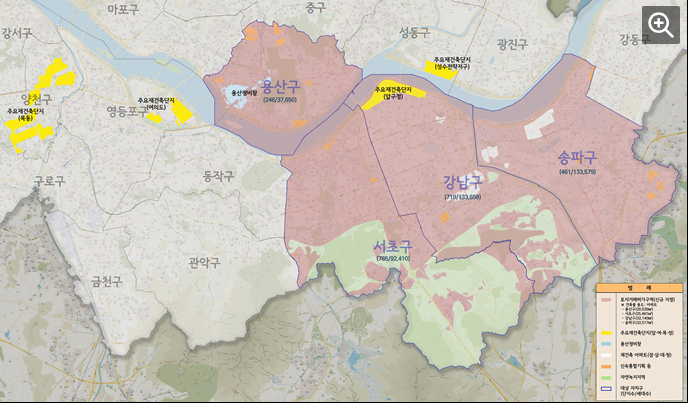 그러다가 2020년 문재인 정부 때부터 서울 한복판 아파트 단지에도 본격 지정됐습니다. 용산 일대와 잠실, 삼성, 대치, 청담동이 토지거래허가구역으로 묶였던 겁니다.