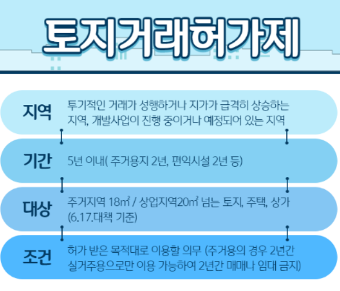 즉 토지거래허가제는 정부가 특정 지역에 대해 토지 거래를 허가제로 규제하는 제도입니다.