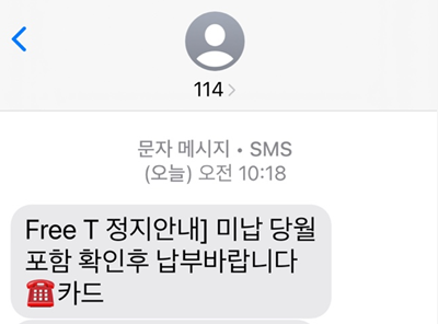 아래처럼 114를 통해서 미납을 통해 Free T 정지가 될 수 있다는 안내가 왔습니다. 일반적으로 핸드폰 요금 3개월 미납이면 발신정지가 되고 데이터 및 인터넷 사용이 불가능합니다. 이후 2주 지나도 미납요금이 납부되지 않으면 수신정지까지 되는데요. 수발신정지된 후 5개월을 넘으면 직권해지까지 진행이 된다고 합니다.