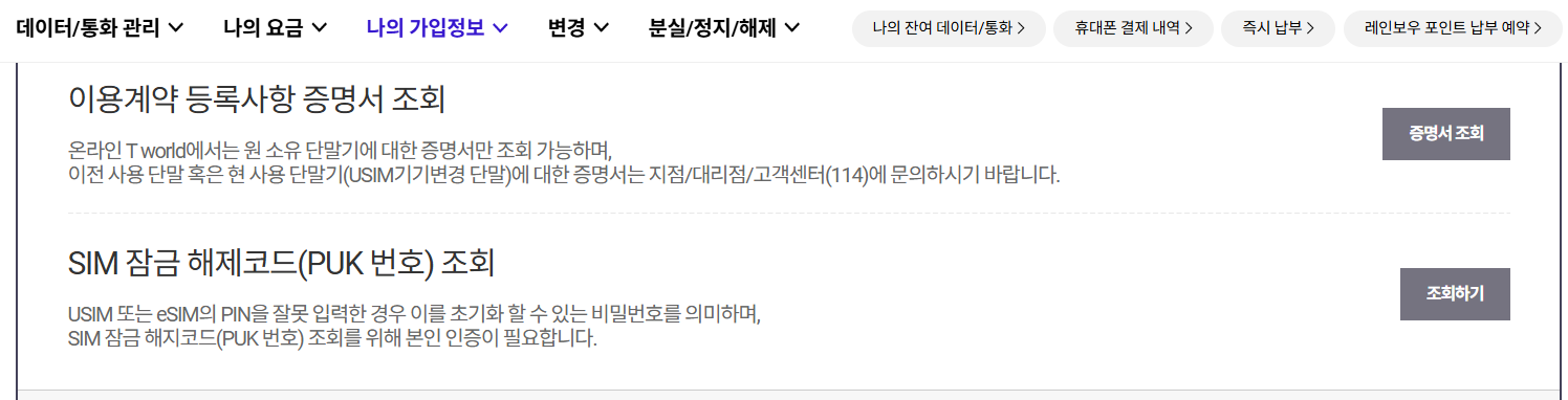 T월드 - My - 나의 가입정보 - SIM 잠금 해제코드(PUK 번호) 조회 메뉴에서 조회가 가능합니다.