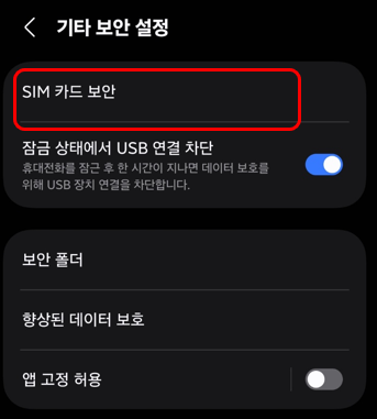이 곳에서 SIM카드 보안 메뉴에서 설정이 가능한데요.
