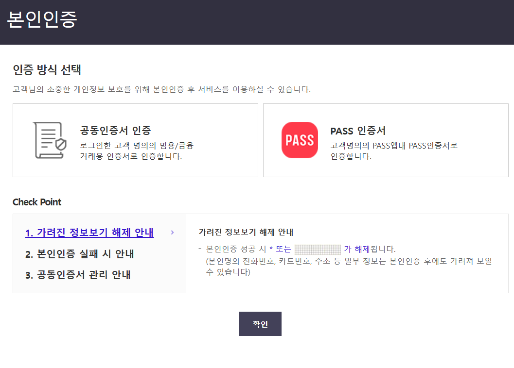 공인 인증 또는 PASS 인증서로 인증하고 확인하시면 됩니다.