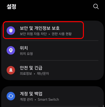 먼저 설정 - 보안 및 개인정보 보호 메뉴로 들어갑니다.