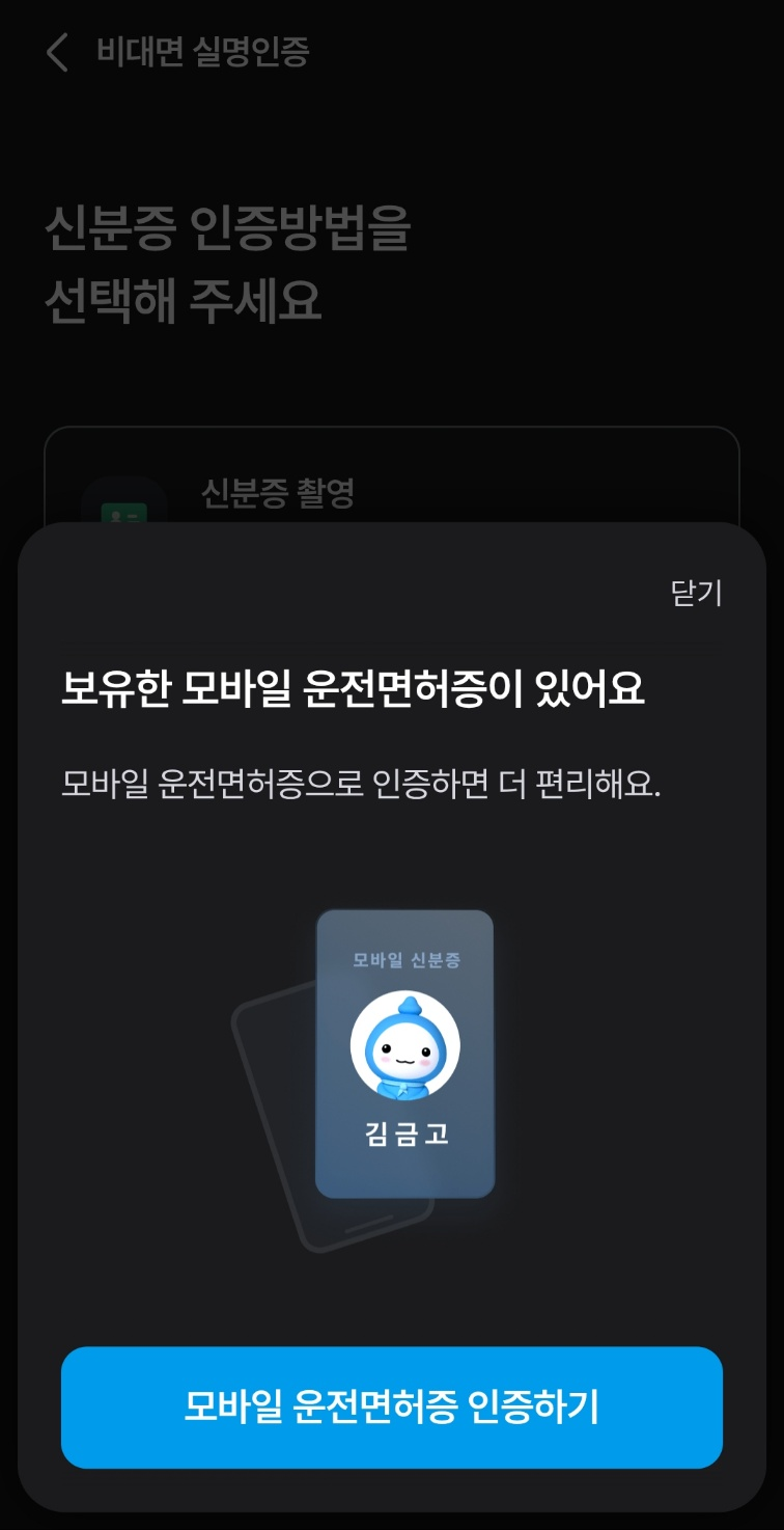 모바일 운전면허증을 자동으로 인식하여 모바일 운전면허증으로 인증을 진행하였습니다.