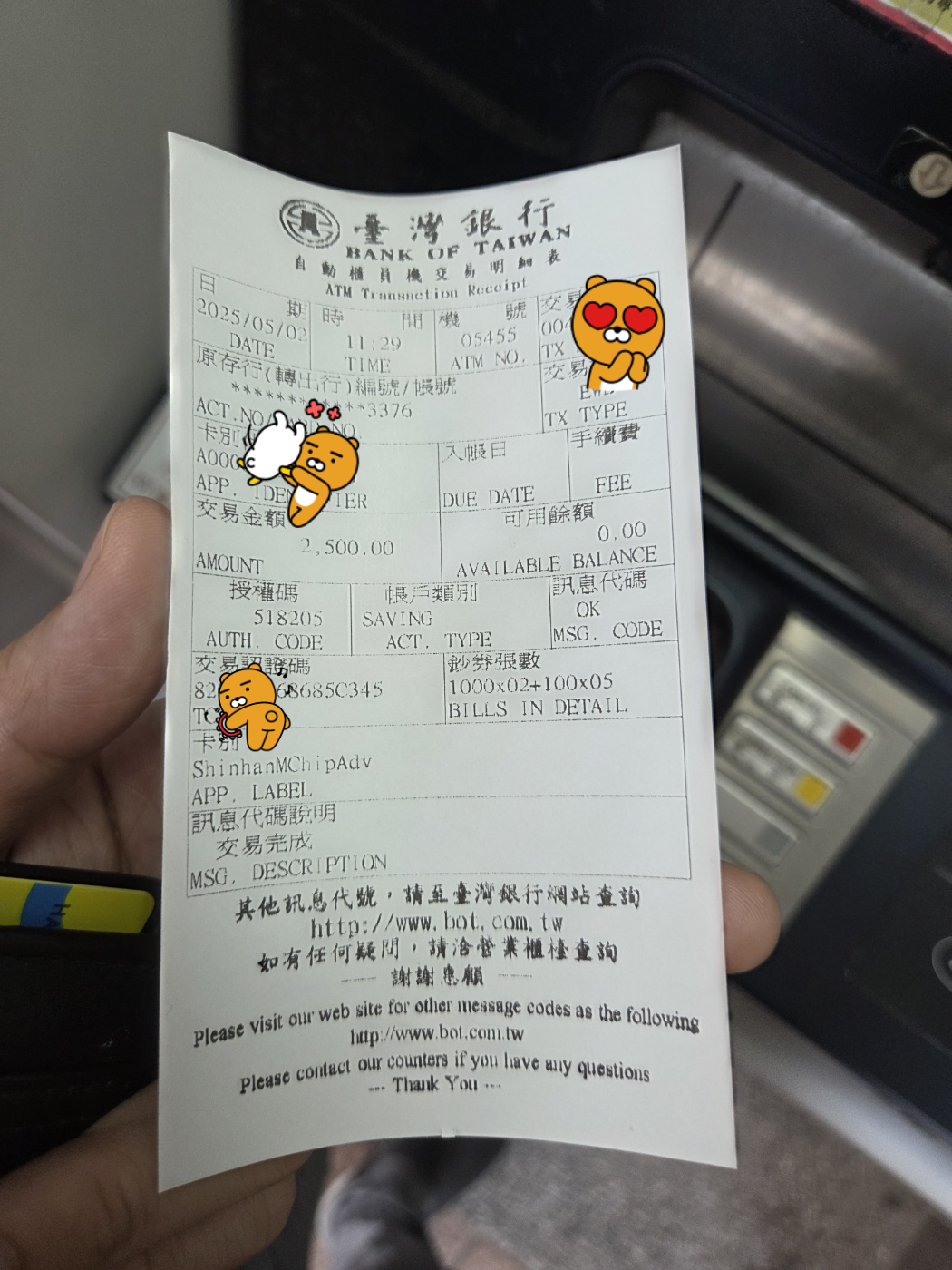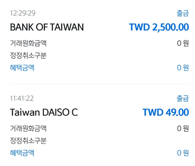 그리고 저의 경우 2500대만 달러를 인출했는데요.