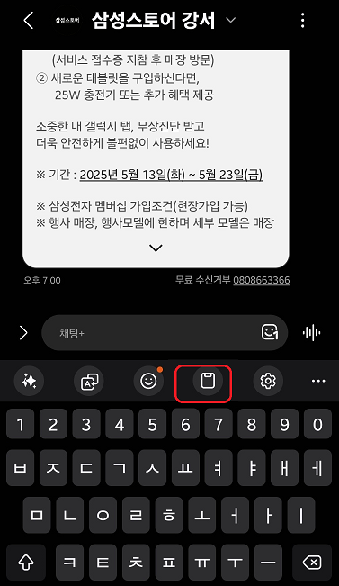 갤럭시 S25에 클립보드에 저장된 내용은 문자 앱등에서 클립보드를 클릭하면 볼 수 있는데요.