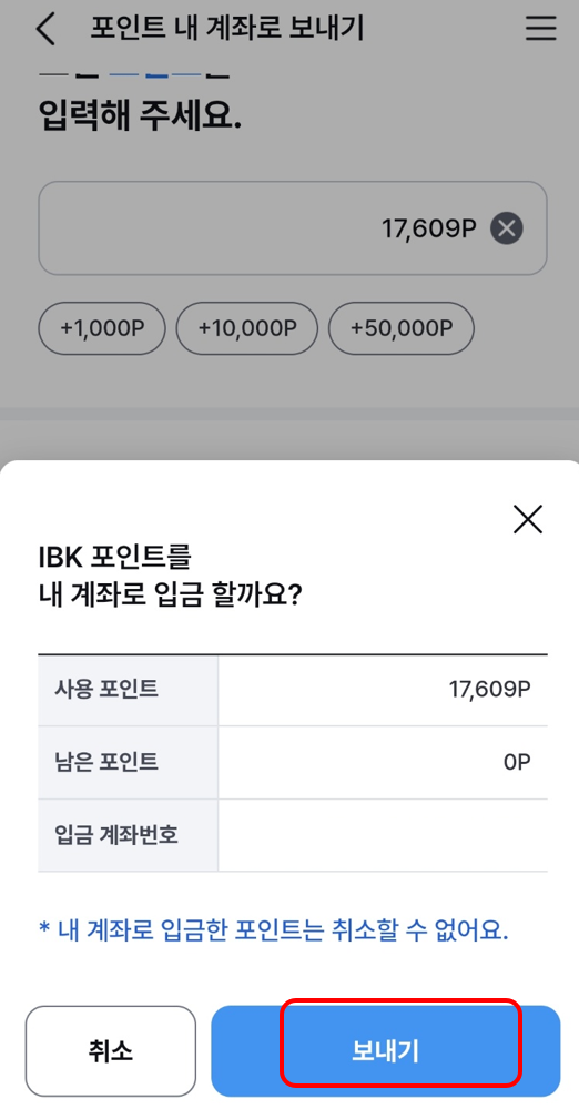 일반적으로 IBK은행 계좌가 있다면 포인트 내 계좌로 보내기가 가장 무난한데요. 바로 현금화할 수 있기 때문입니다.