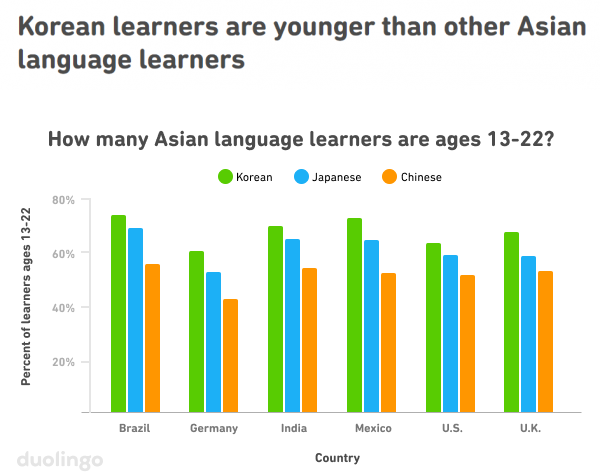작년에 7위 였는데 이탈리어를 제치고 6위를 차지했다고 합니다. 이 뿐만 아니라 한국어를 배우는 연령층이 가장 젊다고 합니다. 현재 일본어가 그다음. 중국어를 배우는 사람들이 제일 늙은 수치를 보여줍니다.