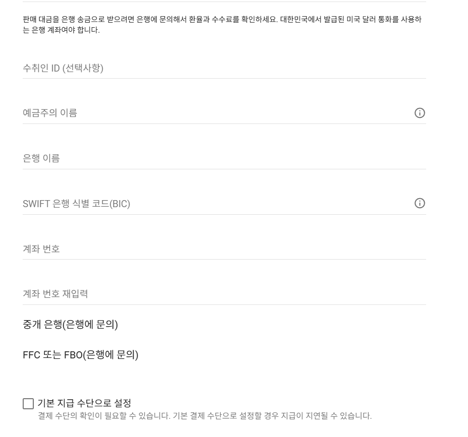 그러면 예금주의 이름, 은행이름, swift 코드, 계좌번호를 입력해야 합니다.