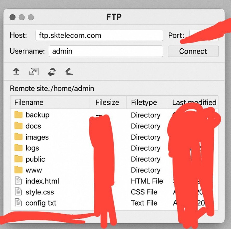 또한 ftp.sktelecom.com 주소로 접속된 FTP 클라이언트 화면도 공개됐다. /home/admin 경로에서 backup, docs, images, logs, public, www 디렉터리와 index.html, config.txt 파일이 목록에 포함돼 있었다. 이러한 정황은 단순한 합성 이미지라기보다는 실제 서버 접근 기록으로 보여지기도 합니다.