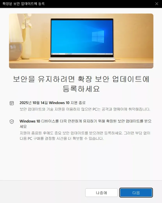 MS에서는 이번 윈도우 10 보안 업데이트 만료와 관련하여 확장된 보안 업데이트를 1년간 추가 제공한다고 하는데요.