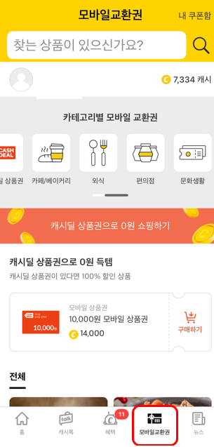 캐시워크 앱의 하단에 모바일 교환권에 가면 내가 원하는 상품으로 교환해서 쓸수 있는데요.