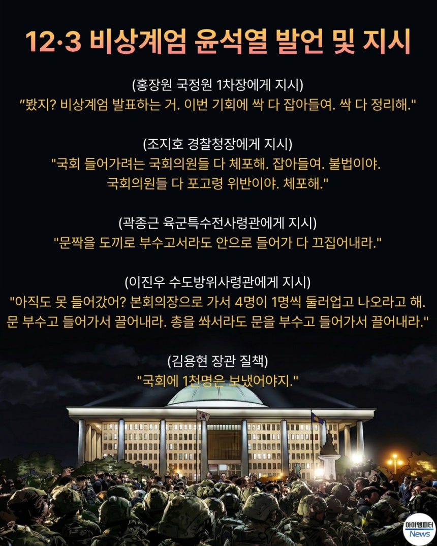 윤석열은 비상계엄 하고 싹 다 정리하라고 지시했고, 국회 들어가려는 국회의원들 다 체포해라고도 지시했다고 합니다.