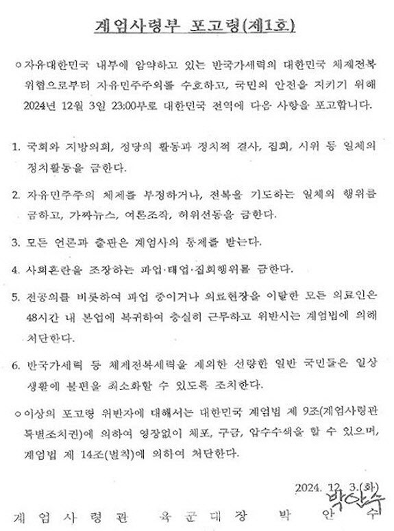 계엄 선포 직후 발표된 포고령에는 국민의 기본권을 제한하는 강력한 조치들이 포함되어 있었습니다.