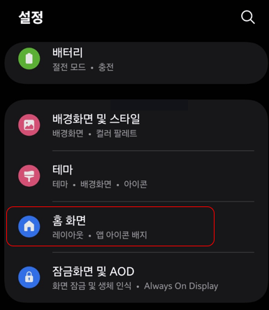 이 경우에는 설정 - 홈화면에 들어갑니다.