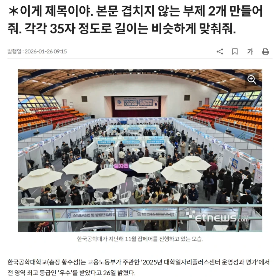 한국공학대학교(총장 황수성)는 고용노동부가 주관한 '2025년 대학일자리플러스센터 운영성과 평가'에서 전 영역 최고 등급인 '우수'를 받았다고 26일 밝혔다. 이번 평가는 기존 대학일자리플러