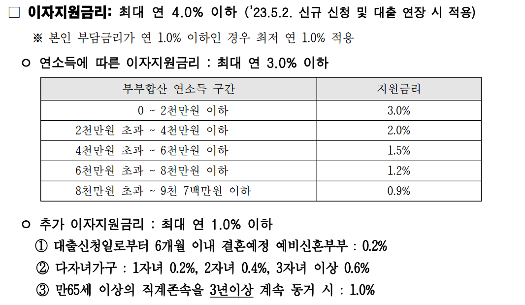 • 이자지원금리  최대 연 3.6% 이하 (다자녀가구 추가 이자지원 우대금리 포함)