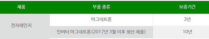 일반적인 모델은 3년이구요. 인버터 마그네트론은 17년 이후 생산제품은 10년간 보증이라고 합니다.