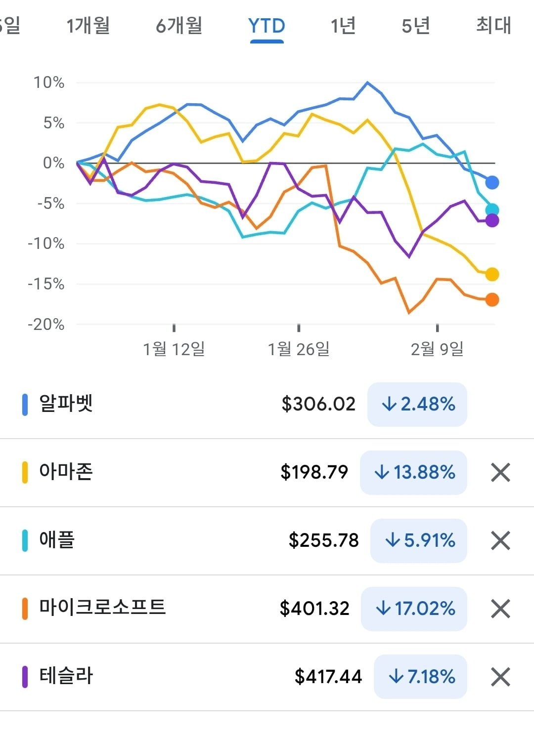 실제로 미국의 M7의 올해 수익률 역시 모두다 마이너스인 상황입니다.