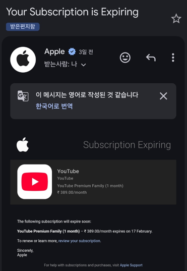 유튜브를 인도로 우회해서 잘 사용하고 있었는데요. 애플에서 갑자기 Your Subcription is Expiring이라면서 메일이 왔습니다.