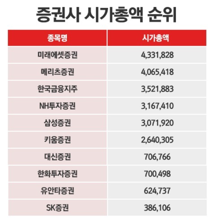 예전에는 미래에셋이 차이가 많이 났으나, 현재 1위는 4조3318억원과  2위인 메리츠가 시가총액 4조654억원으로, 두 증권사의 시가총액 차이는 2664억원으로 상황에 따라 1거래일 만에 순위가 뒤바뀔 수 있는 사정권에 접어들었다고 볼 수 있습니다.