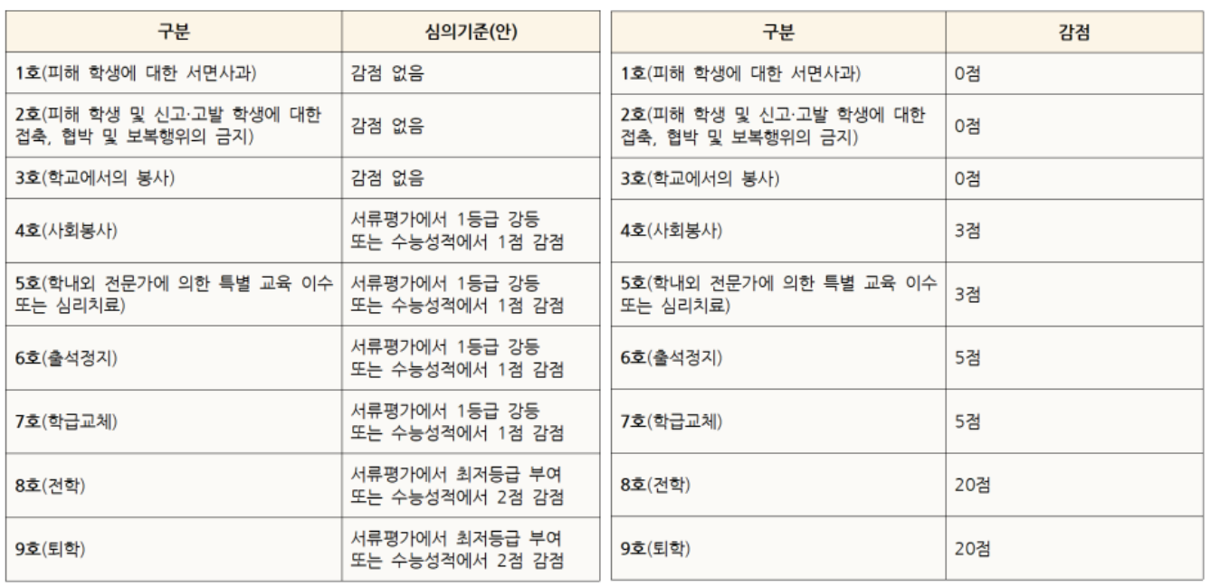 - 5호(학내외 전문가에 의한 특별 교육 이수 또는 심리치료) : 서류평가에서 1등급 강등 또는 수능성적에서 1점 감점