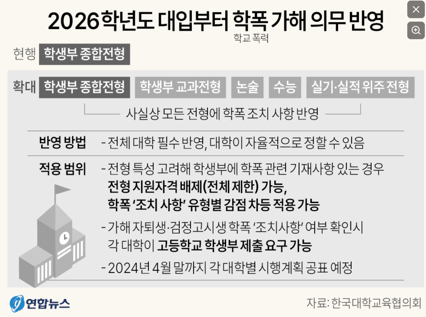 대교협에 따르면 26년 대입부터 학교폭력 가해 의무 반영 되게 되는데요. 사실상 모든 전형에 학폭 조치 사항을 반영하도록 되어 있습니다.