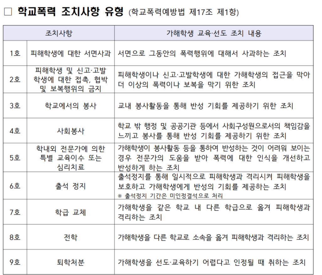 1호는 피해학생에 대한 서면 사과부터 9호는 퇴학처분입니다.