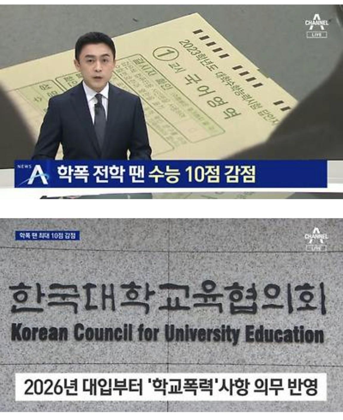 2026년 대입부터 '학교폭력'사항 의무 반영하고 학폭으로 6호 이상의 처분을 받은 경우에는 수능점수도 감점한다고 합니다.