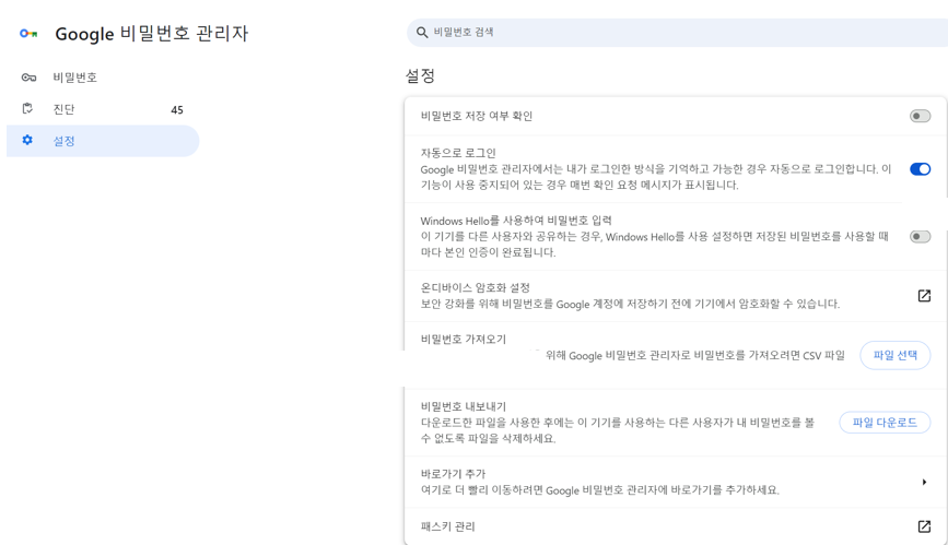 그리고 마지막에 있는 설정 메뉴에 가시면 비밀번호를 내보내고, 다시 가져오는 것도 가능합니다.