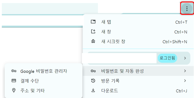 크롬 웹브라우저에서도 상단의 점점점 더보기를 누른다음 하단 비밀번호 및 자동완성 메뉴에서 Google 비밀번호 관리자를 확인할 수 있습니다.