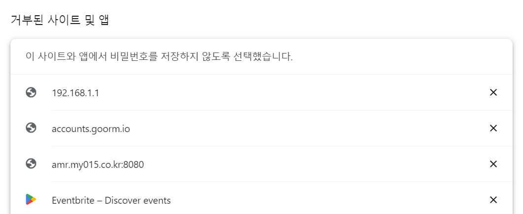 이 외에 특정 사이트에 비밀번호 저장하지 않도록 설정한 경우 이를 확인할 수 있습니다.
