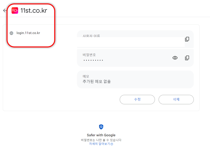 사이트 별로 어떤 비밀번호가 있는지 알 수 있고, 또 여기에 수정하거나 삭제하는 것도 가능합니다.