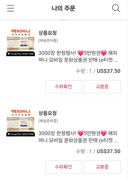 구매내역에서 교환증을 누르면 코드를 볼 수 있습니다.