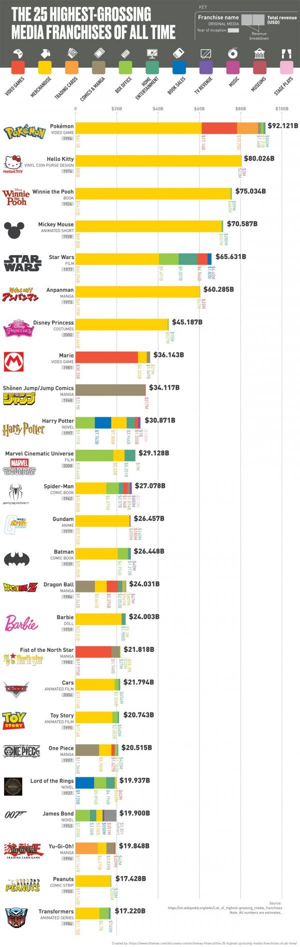1위는 역시 포켓몬입니다. 92빌리언 달러인데요. 한화로 약 130조 정도 될것 같네요.