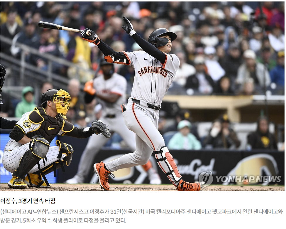 29일 빅리그 데뷔전에서 3타수 1안타 1타점을 올린 이정후는 30일에는 첫 멀티 히트(5타수 2안타 1타점)를 달성했고, 31일에는 홈런포까지 쏘아 올리며, 바람몰이를 시작하고 있습니다.