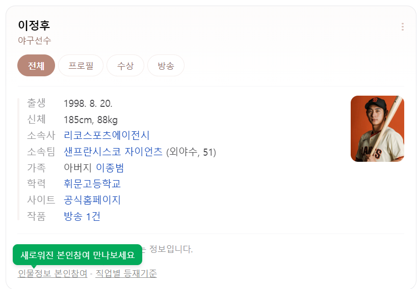 이종범 선수의 아들로 어렸을때부터 유명했습니다. 바람의 아들인 이종범 선수의 아들이라서 바람의 손자라는 별명이 있는데요. 현재 샌프란시스코 자이언츠의 외야수로 뛰고 있습니다.