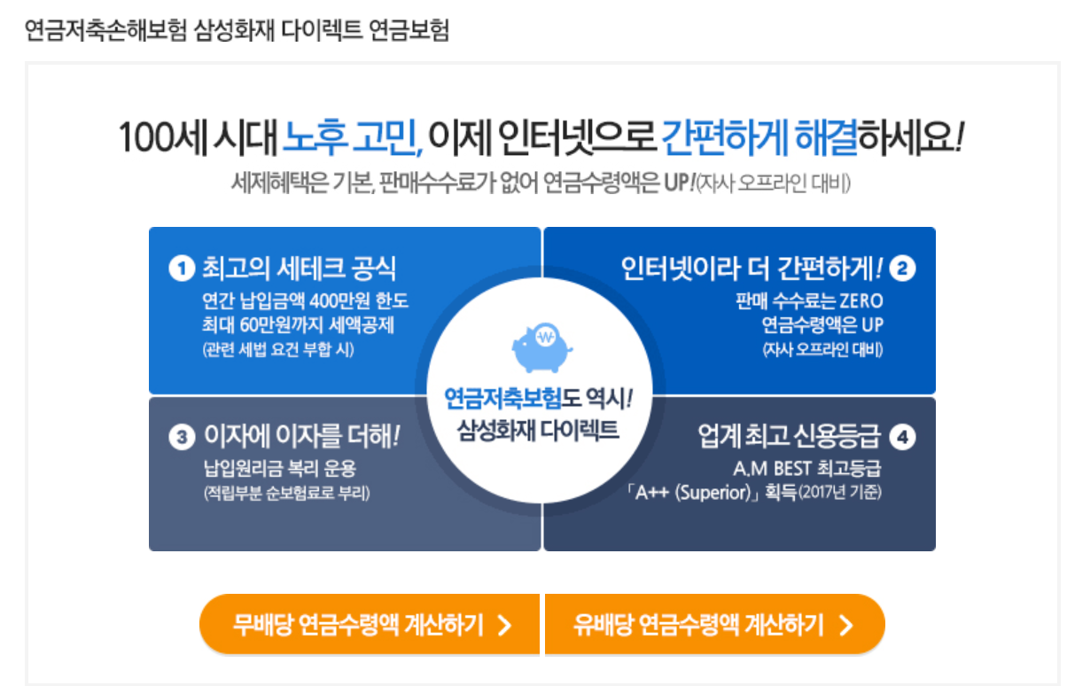 삼성화재에서 연금저축을 가입하였습니다. 아래 상품과는 다르나, 당시 은행에서 해주는 것을 세액공제 받는다고 생각하고 가입을 해서 연간 400만원을 납부하여 운영하였습니다.