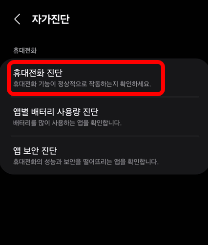 자가진단 메뉴에는 휴대전화 진단/앱별 배터리 사용량 진단/ 앱 보안 진단 등을 실행할 수 있습니다