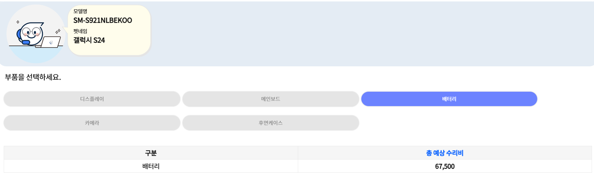 무상교체가 아닐때, 서비스센터에서 유상수비리는 S24의 경우 67500원이라고 하네요.