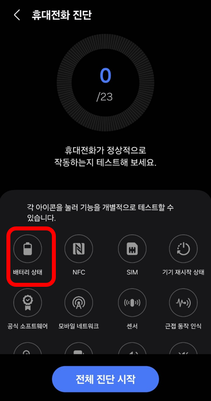 이 중에서 오늘은 휴대전화 진단 메뉴로 들어가서 배터리 상태를 확인하겠습니다.